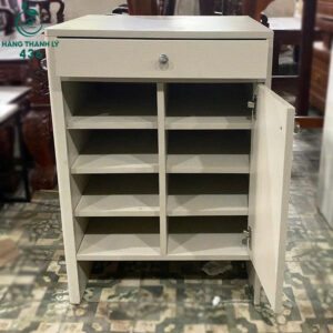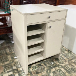 - Mô tả: Chiếc tủ giày này với tông màu trắng ngà hoặc be nhạt, phù hợp với nhiều không gian nội thất hiện đại và tối giản. Tủ được trang bị một ngăn kéo tiện lợi phía trên cùng để cất giữ phụ kiện nhỏ, một khoang kệ mở bên trái lý tưởng để đựng giày dép hàng ngày, và một cánh tủ đóng kín bên phải giúp cất giữ những đôi giày ít dùng hoặc vật dụng khác gọn gàng. Tay nắm kim loại đơn giản, tinh tế. Đây là giải pháp lưu trữ giày dép hiệu quả, giúp không gian luôn ngăn nắp và sạch sẽ.