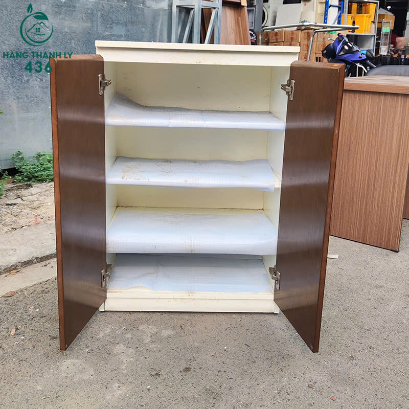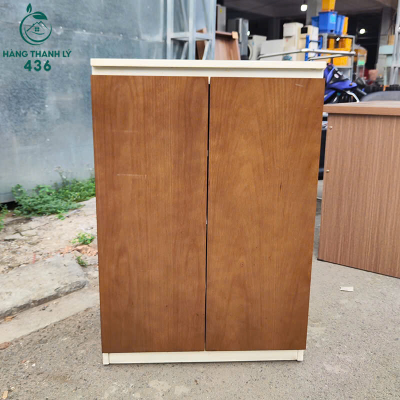 Mô tả: Mẫu tủ giày thanh lý thiết kế đơn giản với 2 cánh mở, bên trong chia nhiều ngăn rộng rãi giúp sắp xếp giày dép gọn gàng, dễ lấy. Tủ làm từ gỗ công nghiệp phủ melamine, bề mặt dễ lau chùi, màu gỗ sáng dễ phối với nhiều không gian như căn hộ, nhà phố hoặc phòng trọ. Kết cấu chắc chắn, bản lề còn tốt, sử dụng ổn định lâu dài.