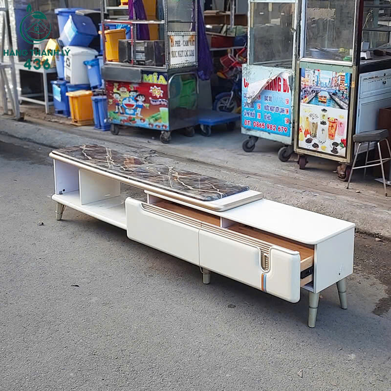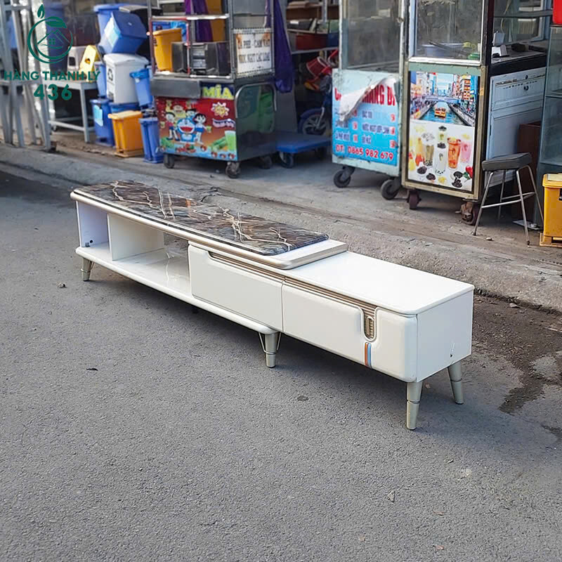 Mô tả: Tủ kệ tivi cũ được thiết kế hiện đại với mặt đá sang trọng và màu sắc trắng tinh tế, phù hợp với nhiều phong cách nội thất. Sản phẩm có ngăn kéo tiện lợi, giúp bạn sắp xếp đồ đạc gọn gàng. Khung tủ được làm từ chất liệu chắc chắn, bền bỉ, đảm bảo sử dụng lâu dài mà vẫn giữ được vẻ đẹp như mới. Mặt đá giúp tủ thêm phần sang trọng và dễ dàng vệ sinh. Đây là sự lựa chọn lý tưởng cho phòng khách hoặc văn phòng của bạn.