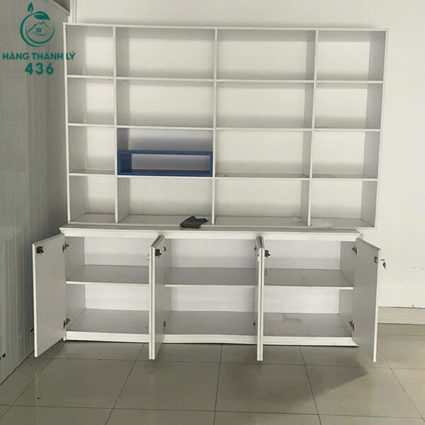 - Mô tả: Tủ trưng bày cũ được thiết kế hiện đại với tông màu trắng chủ đạo, mang lại cảm giác sang trọng và sạch sẽ. Phần trên gồm nhiều ngăn kệ mở, giúp dễ dàng sắp xếp và trưng bày các vật dụng, sản phẩm hoặc tài liệu. Phần dưới là hệ tủ có cánh mở, chia thành ba khoang riêng biệt, giúp lưu trữ đồ đạc gọn gàng, tránh bụi bẩn. Chất liệu gỗ công nghiệp, bề mặt nhẵn mịn, dễ lau chùi, phù hợp cho văn phòng, cửa hàng, hoặc không gian gia đình hiện đại. Thiết kế chắc chắn, bền đẹp.