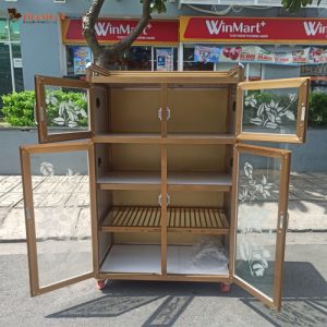 Mô tả: mẫu tủ nhôm kính để chén, tủ 2 cánh có 2 tầng. Tầng dưới có 3 ngăn, tầng trên có 1 ngăn. Mẫu tủ được làm bằng nên rất nhẹ, dễ dàng di chuyển.