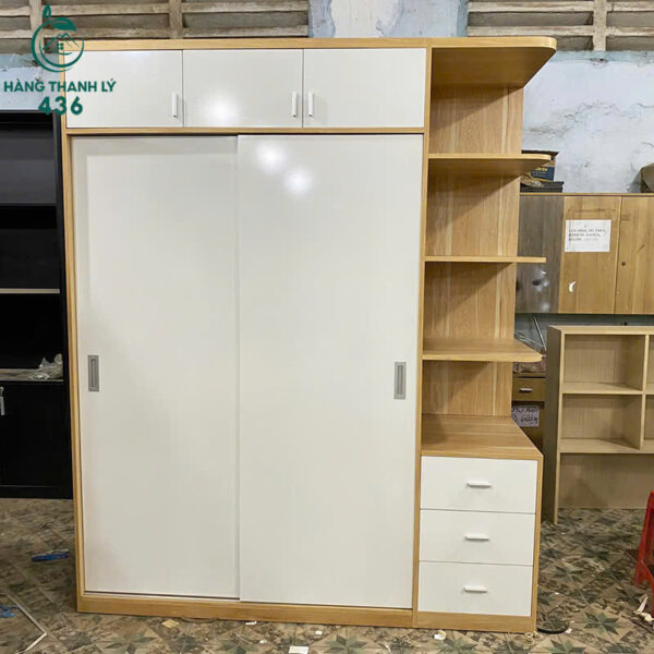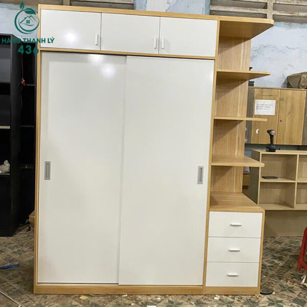 - Mô tả: Tủ quần áo cửa lùa thiết kế hiện đại, gọn gàng với 2 cánh trượt dễ sử dụng, giúp tiết kiệm không gian tối đa. Sản phẩm làm từ gỗ công nghiệp, màu gỗ sáng kết hợp trắng tinh tế, phù hợp nhiều không gian. Bên hông tủ tích hợp kệ góc mở cùng 4 ngăn kéo nhỏ giúp người dùng tiện để đồ trang trí, vật dụng cá nhân hoặc phụ kiện. Tủ mới hơn 99%, cánh trượt nhẹ, ngăn chứa rộng rãi, rất thích hợp cho phòng ngủ gia đình, căn hộ hoặc nhà trọ cao cấp.