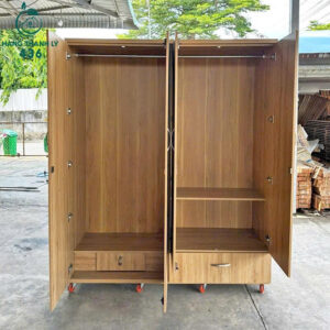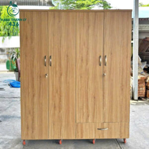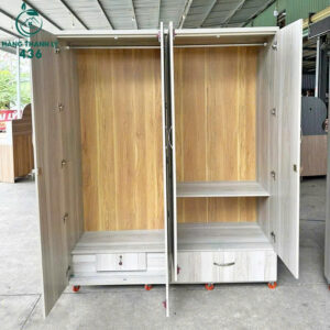 - Mô tả: Tủ quần áo gỗ công nghiệp 4 cánh, bên trong có chia khoang riêng tiện lợi để phân loại đồ đạc. Một bên gồm thanh treo quần áo và ngăn kéo nhỏ, bên còn lại có đợt chia tầng kèm theo hộc kéo lớn. Dưới đáy tủ gắn bánh xe giúp di chuyển dễ dàng, phù hợp cho nhà thuê, phòng trọ hoặc không gian cần thay đổi bố cục linh hoạt. Tay nắm inox chắc chắn, bề mặt tủ mịn dễ lau chùi, khoá riêng biệt tăng độ an toàn khi sử dụng.