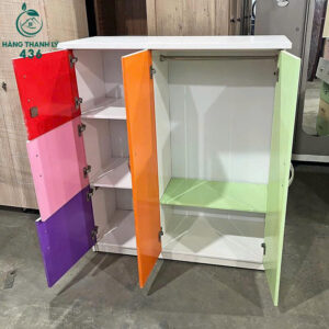 - Mô tả: Tủ quần áo gỗ cũ kiểu dáng nhỏ gọn, phối màu nổi bật với cánh tủ đỏ, cam, hồng, tím, xanh lá vô cùng bắt mắt. Tủ gồm 1 khoang lớn treo đồ có thanh inox chắc chắn và nhiều ngăn nhỏ để xếp quần áo, chăn gối hoặc đồ cá nhân. Chất liệu gỗ, dễ lau chùi, ít bám bụi. Thiết kế tiện lợi, phù hợp cho phòng ngủ gia đình, phòng trẻ em, hoặc nhà trọ cần tủ quần áo gọn và tiết kiệm không gian. Hàng cũ còn mới khoảng 90%, cửa đóng mở nhẹ, bền bỉ khi sử dụng lâu dài.