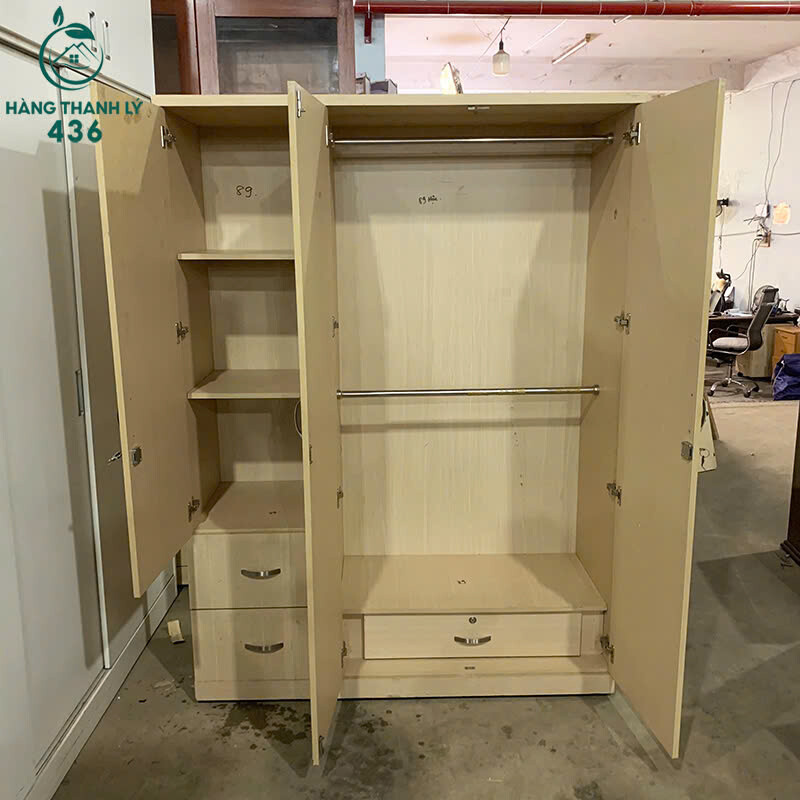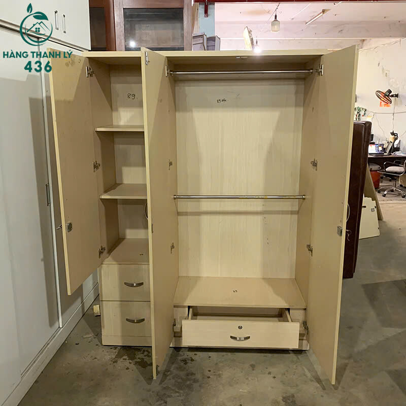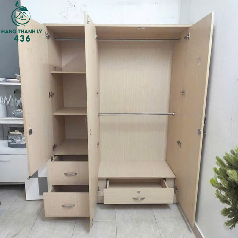 Mô tả: Tủ quần áo thiết kế 3 cánh mở, bên trong chia ngăn khoa học gồm khu treo đồ dài, nhiều kệ xếp đồ gấp và hộc kéo tiện lợi để đồ cá nhân. Chất liệu gỗ công nghiệp màu vân gỗ sáng, dễ lau chùi, phù hợp sử dụng cho phòng ngủ gia đình, phòng trọ hoặc căn hộ nhỏ. Tủ đứng vững, bản lề còn tốt, đóng mở nhẹ nhàng.