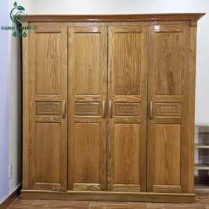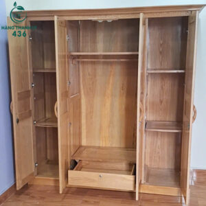 - Mô tả: Tủ quần áo gỗ thiết kế 4 cánh mở hiện đại, phù hợp cho không gian phòng ngủ gia đình. Tủ có màu gỗ sáng tự nhiên, bề mặt được xử lý nhẵn mịn, tôn lên vẻ sang trọng và ấm cúng. Bên trong tủ gồm nhiều ngăn tiện ích: ngăn treo quần áo rộng rãi ở giữa, các ngăn bên hông dùng để gấp đồ, cất phụ kiện hoặc chăn màn. Phía dưới có thêm một ngăn kéo nhỏ giúp sắp xếp đồ đạc gọn gàng hơn. Tay nắm gỗ bo tròn an toàn, dễ sử dụng. Kết cấu chắc chắn, bền bỉ theo thời gian.