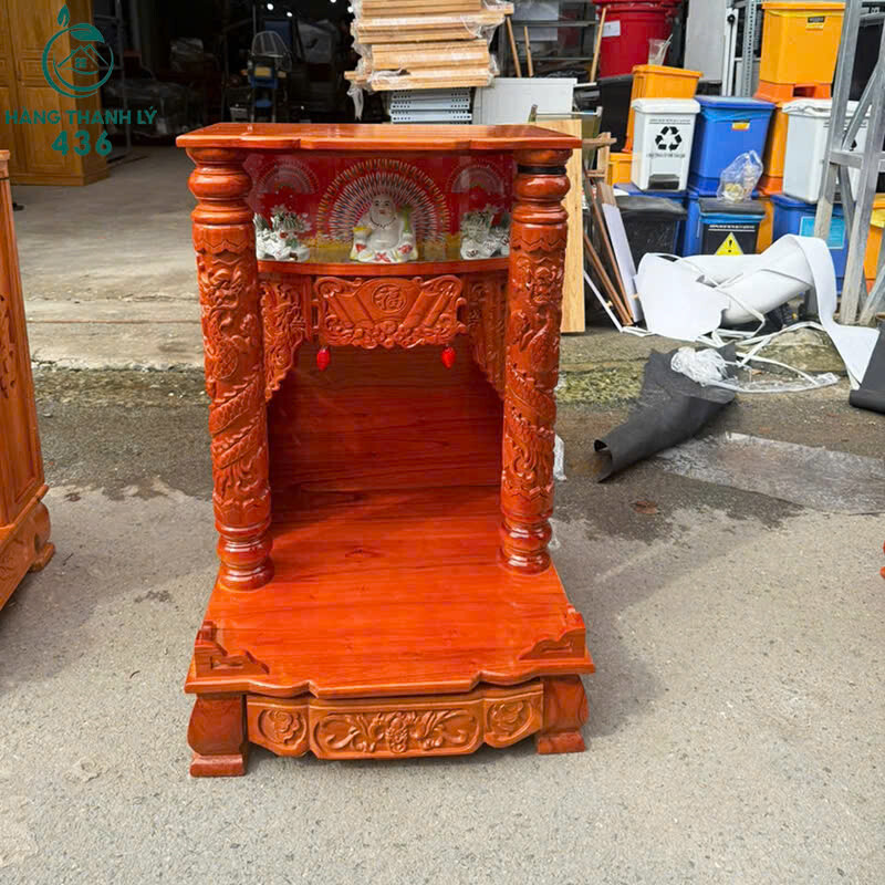 - Mô tả: Bàn thờ Ông Địa được làm từ gỗ tự nhiên màu đỏ bóng. Mặt bàn và các trụ được chạm khắc rồng tinh xảo, thể hiện sự trang nghiêm và may mắn. Phía trên có mái che cong nhẹ, phần chân chạm hoa văn nổi tạo điểm nhấn sang trọng. Bên trong bố trí khoang thờ rộng rãi, có thể đặt tượng Thần Tài – Ông Địa, bình hoa, chén nước, đèn thờ và các vật phẩm phong thủy. Hàng mới 99%, kết cấu chắc chắn, phù hợp đặt trong nhà ở, cửa hàng, quán ăn hoặc văn phòng kinh doanh để cầu tài lộc và bình an.
