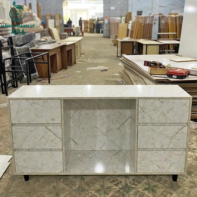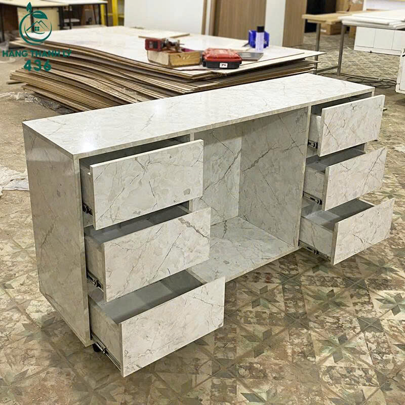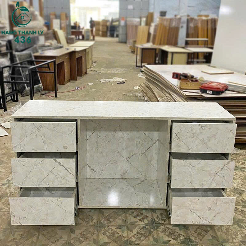 - Mô tả: Tủ trưng bày giả đá thiết kế hiện đại, sang trọng, phù hợp sử dụng cho showroom, cửa hàng hoặc văn phòng. Bề mặt phủ vân đá hoa cương đẹp mắt, dễ lau chùi và chống trầy xước. Tủ có 6 hộc kéo chia đều hai bên, giúp lưu trữ giấy tờ, phụ kiện, hoặc các vật dụng cần thiết. Phần mặt trên rộng rãi, thích hợp để trưng bày sản phẩm, bình hoa, vật trang trí. Kết cấu tủ chắc chắn, chất liệu đảm bảo độ bền và thẩm mỹ.