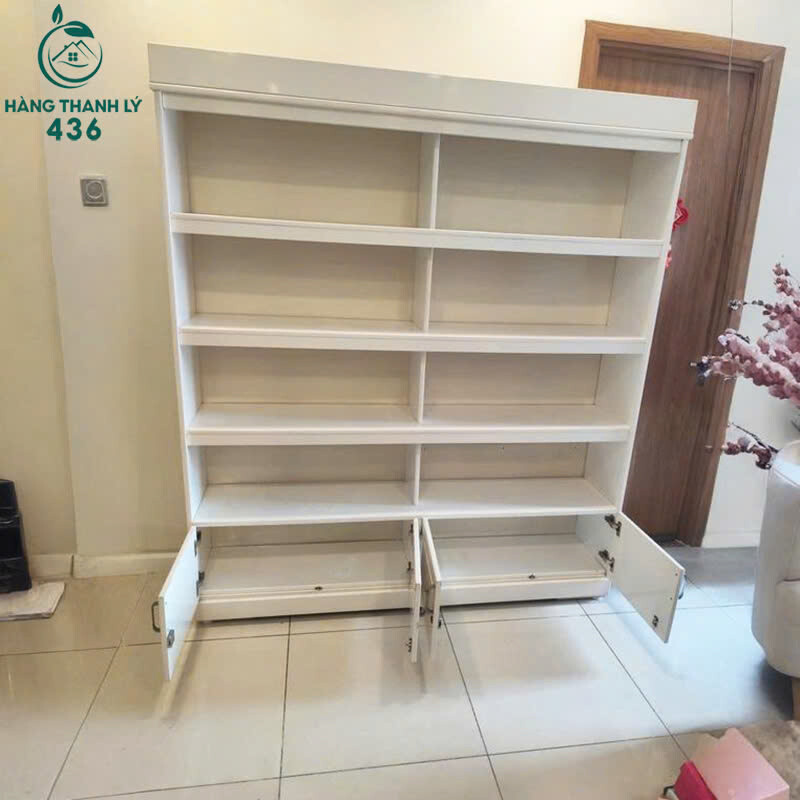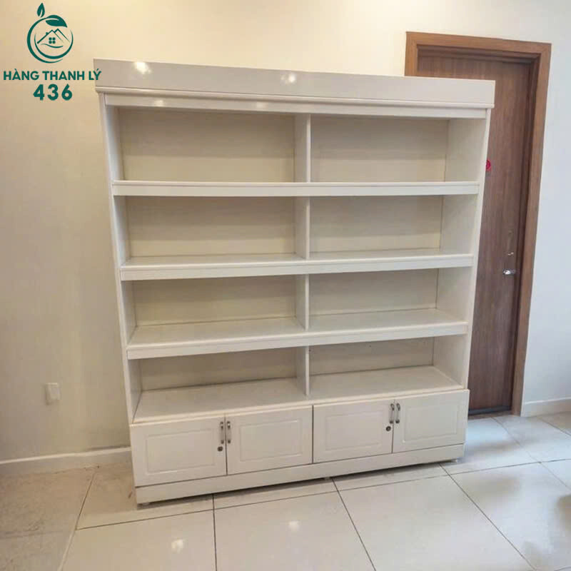 Mô tả: Mẫu tủ trưng bày cũ này có thiết kế dạng đứng với nhiều tầng kệ mở phía trên, giúp sắp xếp và trưng bày sách, hồ sơ, sản phẩm hoặc vật dụng trang trí một cách gọn gàng, dễ nhìn. Phía dưới được bố trí các ngăn tủ có cánh đóng, thuận tiện cất giữ đồ ít dùng, giúp không gian luôn ngăn nắp. Tông màu trắng tạo cảm giác sáng sủa, sạch sẽ, phù hợp sử dụng cho cửa hàng, văn phòng, thư viện nhỏ hoặc phòng làm việc tại nhà. Tủ đã qua sử dụng nhưng còn chắc chắn, kết cấu ổn định, đáp ứng tốt nhu cầu sử dụng lâu dài.