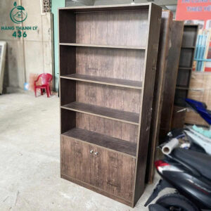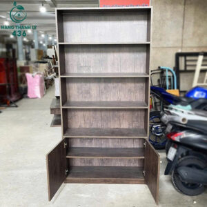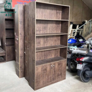 - Mô tả: Tủ được thiết kế đơn giản và vững chắc, được làm từ gỗ công nghiệp với vân gỗ màu nâu sẫm, mang lại vẻ đẹp mộc mạc và sang trọng. Tủ được chia thành bốn ngăn kệ mở rộng rãi ở phía trên, lý tưởng để trưng bày sách, đồ trang trí hoặc vật dụng cá nhân. Phía dưới là một khoang tủ kín với hai cánh cửa mở, cung cấp không gian lưu trữ kín đáo.