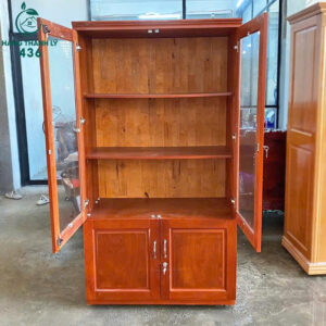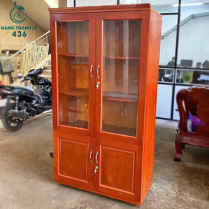 - Mô tả: Tủ có thiết kế sang trọng và chức năng, gỗ tự nhiên với tông màu nâu đỏ ấm áp và vân gỗ đẹp mắt. Tủ được chia thành hai phần chính: phía trên là hai cánh cửa kính trong suốt, bên trong có các ngăn kệ để hồ sơ, sách,… Phía dưới là hai cánh cửa gỗ kín đáo, cung cấp không gian lưu trữ riêng tư, giúp giữ cho không gian luôn gọn gàng.