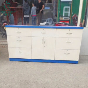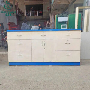 - Mô tả: Chiếc tủ này là một giải pháp lưu trữ hiệu quả cho cả văn phòng. Tủ có thiết kế thông minh với nhiều ngăn kéo ở hai bên và một khoang tủ trung tâm có cánh, giúp bạn sắp xếp tài liệu hoặc đồ dùng một cách khoa học. Tủ được làm từ gỗ với tông màu trắng ngà kết hợp viền xanh dương ở chân, mang lại vẻ ngoài sạch sẽ và hiện đại. Kệ kính phía trên thích hợp để trưng bày các sản phẩm.