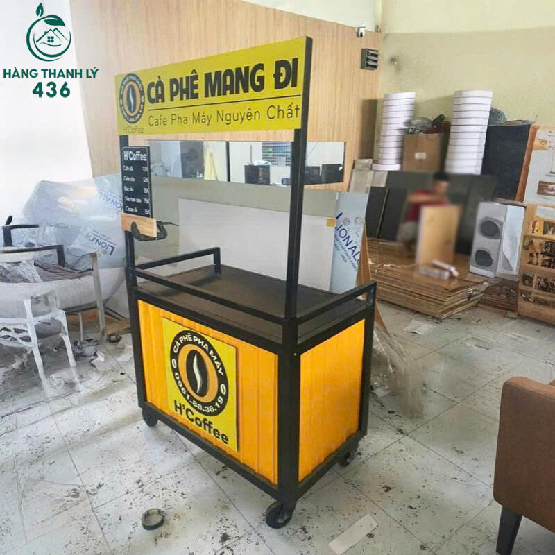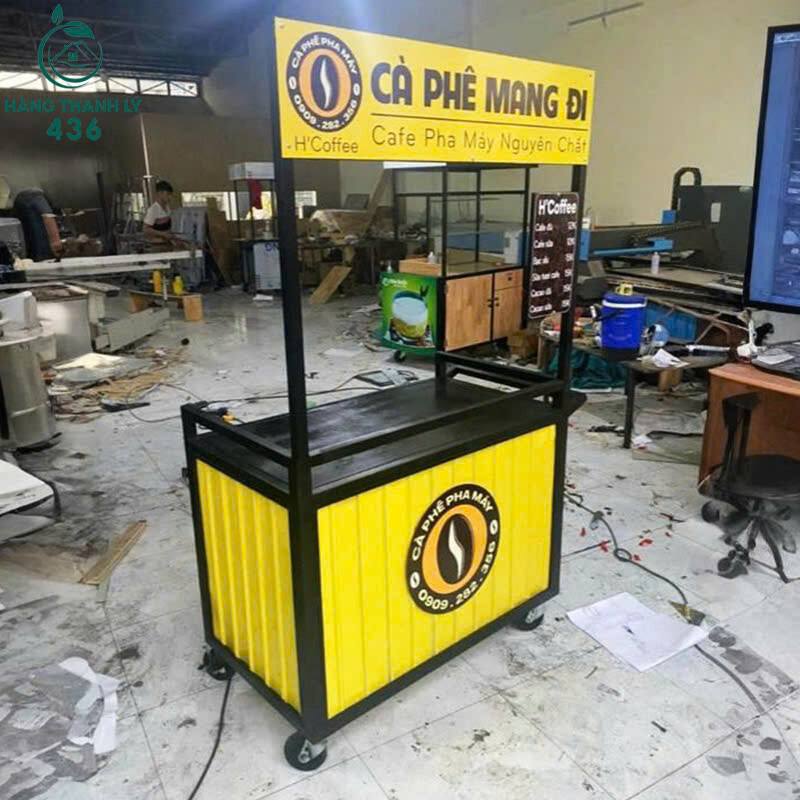 Mô tả: Mẫu xe bán cà phê mang đi có thiết kế vuông vức, khung sắt sơn đen chắc chắn, phối gỗ màu vàng nổi bật, dễ gây chú ý khi đặt trước cửa hàng, vỉa hè hoặc khu văn phòng. Phía trên có bảng hiệu “Cà Phê Mang Đi – Cafe Pha Máy Nguyên Chất”, phù hợp kinh doanh cafe take away. Mặt quầy rộng rãi, đủ không gian đặt máy pha cà phê, máy xay và dụng cụ pha chế. Xe được trang bị bánh xe chịu lực, di chuyển linh hoạt, tiện thay đổi vị trí bán.