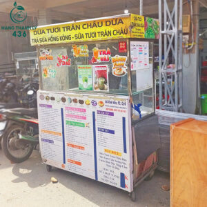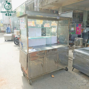 - Mô tả: Xe bán hàng cũ chất liệu inox, thiết kế chắc chắn, đi kèm tủ kính phía trên dùng để trưng bày thực phẩm hoặc menu. Phần mặt bàn phẳng, dễ lau chùi, thích hợp để sơ chế, chế biến hoặc đặt món ăn. Phía dưới gồm nhiều ngăn tủ có khóa giúp cất giữ vật dụng, nguyên liệu an toàn. Kệ trên làm bằng kính trong suốt dễ nhìn, có thể gắn đèn hoặc dán decal trang trí. Bánh xe gắn dưới giúp dễ dàng di chuyển ra vào khi cần thiết. Xe phù hợp cho các quán ăn vỉa hè, bán nước, bánh mì, đồ ăn vặt…