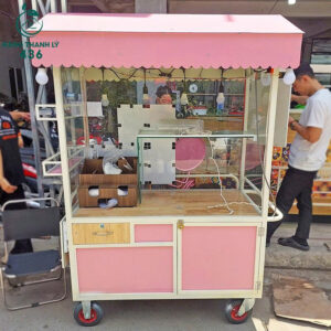 - Mô tả: Chiếc xe đẩy bán hàng này có thiết kế nổi bật và bắt mắt, với tông màu hồng chủ đạo, rất phù hợp cho việc kinh doanh trà sữa hoặc đồ uống vặt. Xe được trang bị mái che và các hình ảnh minh họa đồ uống hấp dẫn, cùng với các biểu tượng chân mèo dễ thương ở phần thân dưới. Phía trước có cửa kính trưng bày sản phẩm và các poster menu, giúp khách hàng dễ dàng lựa chọn. Xe có bánh xe tiện lợi cho việc di chuyển và một bàn gấp nhỏ ở bên cạnh để phục vụ khách.