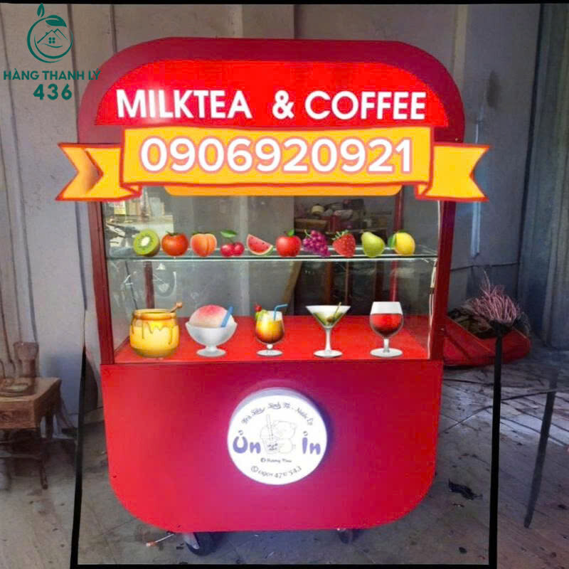 Mô tả: Mẫu xe bán trà sữa có thiết kế bo tròn gọn gàng, màu đỏ nổi bật, dễ thu hút khách ngay từ xa. Phần bảng hiệu phía trên gắn đèn LED sáng rõ, hiển thị “MilkTea & Coffee”, rất phù hợp bán buổi tối hoặc khu vực đông người. Mặt trước có kệ kính trưng bày ly nước, trái cây trang trí giúp gian hàng nhìn chuyên nghiệp hơn. Xe có bánh xe di chuyển linh hoạt, thuận tiện đẩy đi các vị trí khác nhau. Kết cấu chắc chắn, không gian bên trong đủ để đặt máy móc nhỏ, nguyên liệu pha chế.